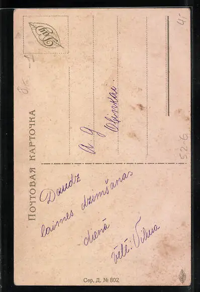Personenbezogene Daten auf der Rückseite der Karte wurden durch blauen Textmarker unkenntlich gemacht. Die blauen Stellen sind auf die Vorderseite durchgeweicht und wirken sich negativ auf das Postkartenfoto aus