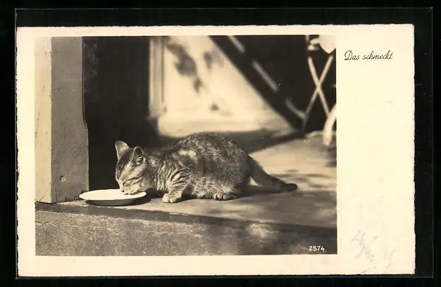 AK Getigertes Kätzchen trinkt aus der Milchschale