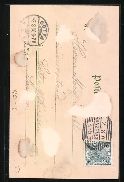 alte Ansichtskarte, gelaufen 1900, rückseitig Klebe- und Papierreste, rückseitig Oberflächenschaden, guter Zustand