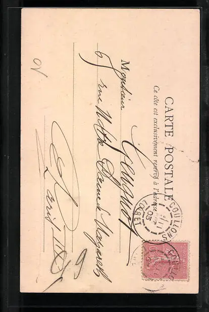 Personenbezogene Daten auf der Rückseite der Karte wurden durch blauen Textmarker unkenntlich gemacht. Die blauen Stellen sind auf die Vorderseite durchgeweicht und wirken sich negativ auf das Postkartenfoto aus