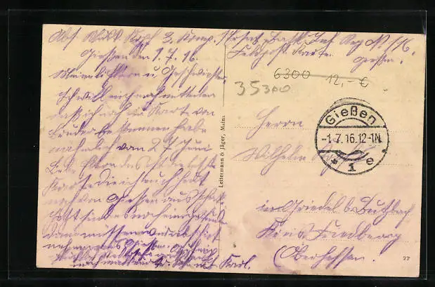 alte Ansichtskarte, gelaufen 1916 als Feldpost, Eckknick li. oben, guter Zustand