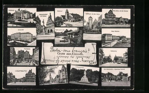 AK Giessen, Rathaus und Kriegerdenkmal, Bahnhof, Universität