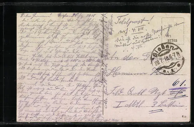 gelaufen 1918 als Feldpost, Eckknick links unten, guter Zustand