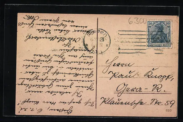 Personenbezogene Daten auf der Rückseite der Karte wurden durch blauen Textmarker unkenntlich gemacht. Die blauen Stellen sind auf die Vorderseite durchgeweicht und wirken sich negativ auf das Postkartenfoto aus