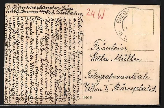 Personenbezogene Daten auf der Rückseite der Karte wurden durch blauen Textmarker unkenntlich gemacht. Die blauen Stellen sind auf die Vorderseite durchgeweicht und wirken sich negativ auf das Postkartenfoto aus