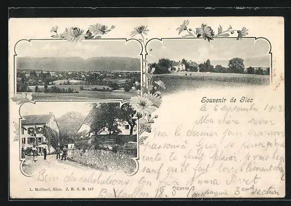AK Giez, Strassenpoartie mit Anwohnern, Panorama mit Feldern