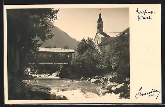 AK Ginzling / Zillertal, Uferpartie mit Kirche