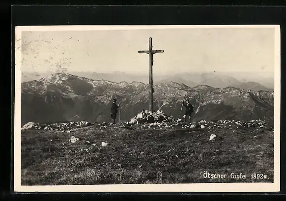 AK Gipfelkreuz und Wanderer auf dem Ötscher-Gipfel