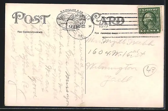 Personenbezogene Daten auf der Rückseite der Karte wurden durch blauen Textmarker unkenntlich gemacht. Die blauen Stellen sind auf die Vorderseite durchgeweicht und wirken sich negativ auf das Postkartenfoto aus