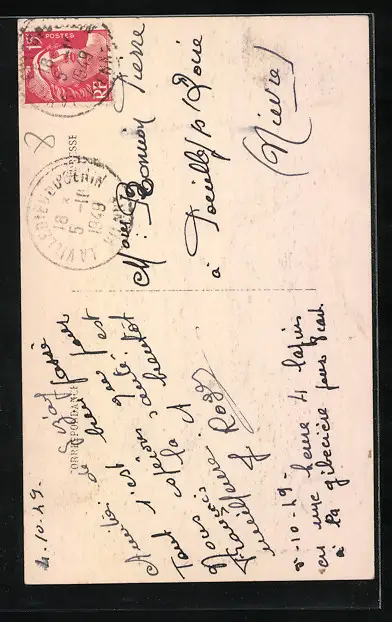 Personenbezogene Daten auf der Rückseite der Karte wurden durch blauen Textmarker unkenntlich gemacht. Die blauen Stellen sind auf die Vorderseite durchgeweicht und wirken sich negativ auf das Postkartenfoto aus