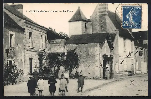 AK Gizeux, La Place avec des enfants et des bâtiments historiques