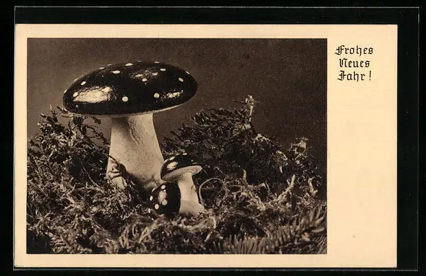AK Glänzende Fliegenpilze im Moos, Neujahrsgruss