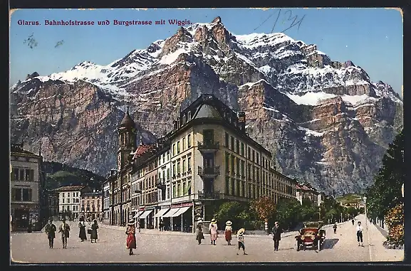 AK Glarus, Burgstrasse und Bahnhofstrasse mit Wiggis