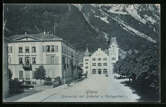AK Glarus, Glarnerhof mit Bahnhof u. Volksgarten