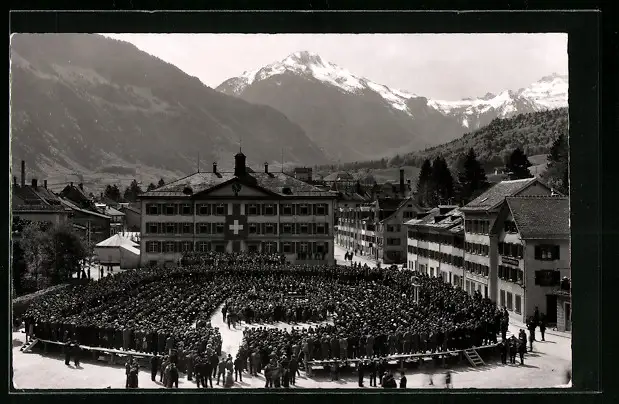 AK Glarus, Ortspartie mit Menschenversammlung