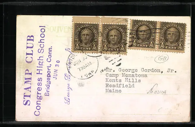 Personenbezogene Daten auf der Rückseite der Karte wurden durch blauen Textmarker unkenntlich gemacht. Die blauen Stellen sind auf die Vorderseite durchgeweicht und wirken sich negativ auf das Postkartenfoto aus