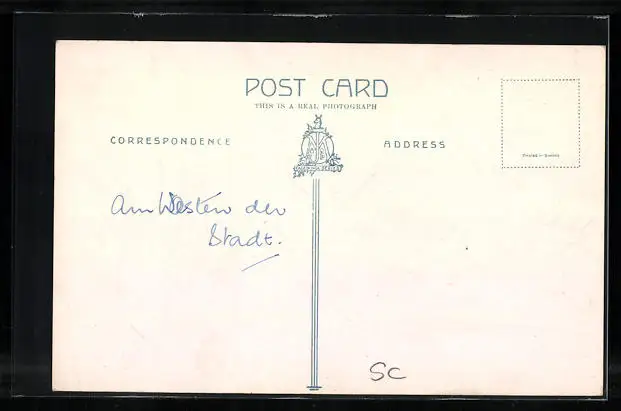 Personenbezogene Daten auf der Rückseite der Karte wurden durch blauen Textmarker unkenntlich gemacht. Die blauen Stellen sind auf die Vorderseite durchgeweicht und wirken sich negativ auf das Postkartenfoto aus