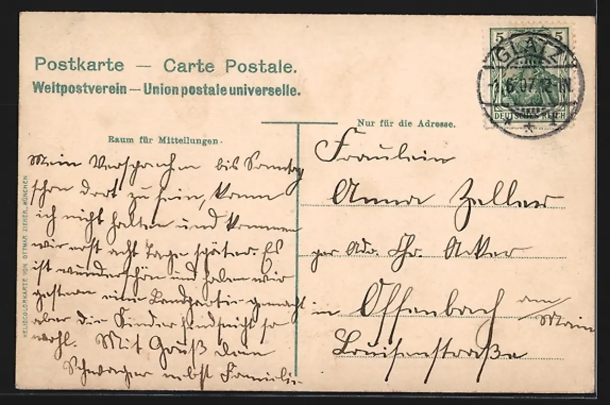 alte Ansichtskarte, gelaufen 1907, Stempelspur, guter Zustand