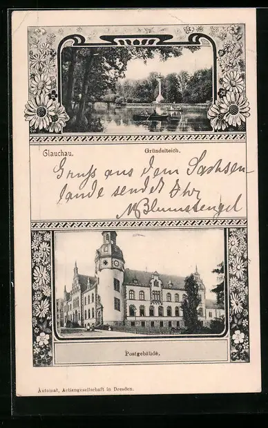 AK Glauchau, Gründelteich, Postgebäude