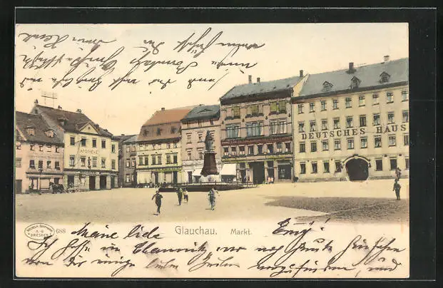 AK Glauchau, Markt mit Apotheke, Geschäften und Denkmal