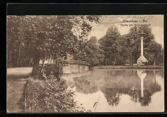AK Glauchau i. Sa., Partie am Gründelteich mit Denkmal