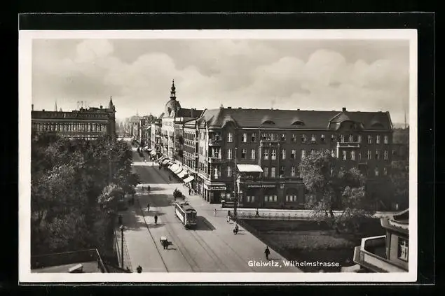 AK Gleiwitz, Wilhelmstrasse mit Strassenbahn