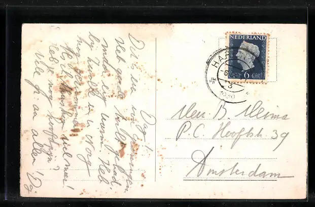 Personenbezogene Daten auf der Rückseite der Karte wurden durch blauen Textmarker unkenntlich gemacht. Die blauen Stellen sind auf die Vorderseite durchgeweicht und wirken sich negativ auf das Postkartenfoto aus