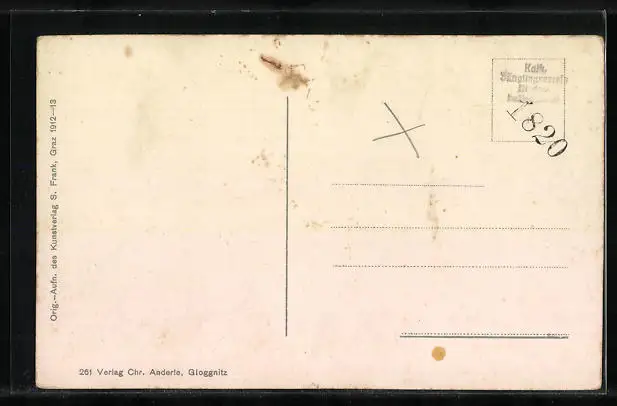 Personenbezogene Daten auf der Rückseite der Karte wurden durch blauen Textmarker unkenntlich gemacht. Die blauen Stellen sind auf die Vorderseite durchgeweicht und wirken sich negativ auf das Postkartenfoto aus