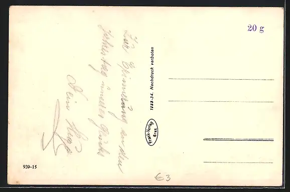 Personenbezogene Daten auf der Rückseite der Karte wurden durch blauen Textmarker unkenntlich gemacht. Die blauen Stellen sind auf die Vorderseite durchgeweicht und wirken sich negativ auf das Postkartenfoto aus
