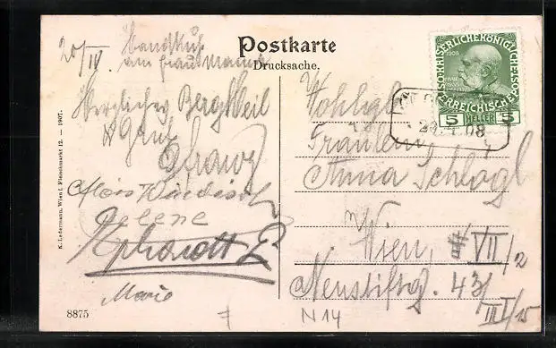 alte Ansichtskarte, gelaufen 1908, Eckknick re. oben, guter Zustand