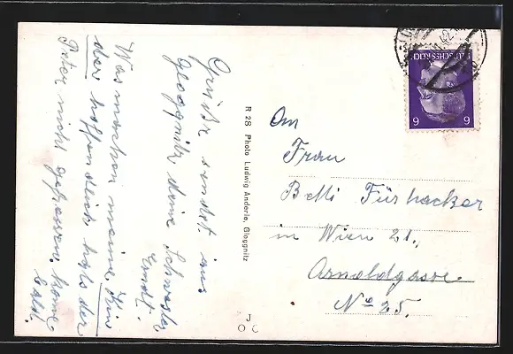 Personenbezogene Daten auf der Rückseite der Karte wurden durch blauen Textmarker unkenntlich gemacht. Die blauen Stellen sind auf die Vorderseite durchgeweicht und wirken sich negativ auf das Postkartenfoto aus