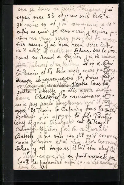 Personenbezogene Daten auf der Rückseite der Karte wurden durch blauen Textmarker unkenntlich gemacht. Die blauen Stellen sind auf die Vorderseite durchgeweicht und wirken sich negativ auf das Postkartenfoto aus