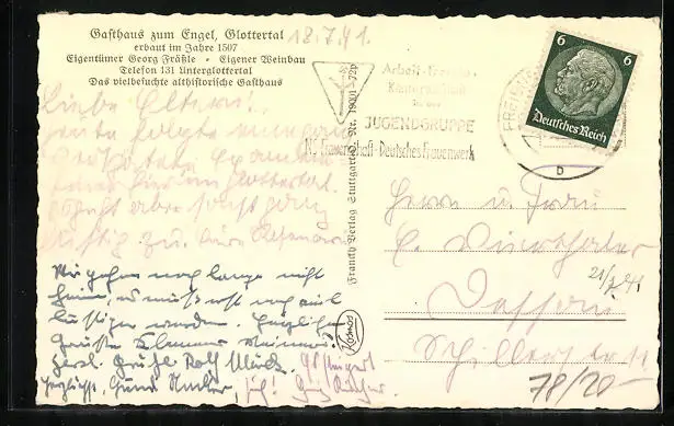 alte Ansichtskarte, gelaufen 1941, Papierstreifen an der rechten Kante, guter Zustand