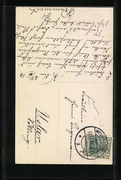 Personenbezogene Daten auf der Rückseite der Karte wurden durch blauen Textmarker unkenntlich gemacht. Die blauen Stellen sind auf die Vorderseite durchgeweicht und wirken sich negativ auf das Postkartenfoto aus