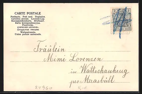 Personenbezogene Daten auf der Rückseite der Karte wurden durch blauen Textmarker unkenntlich gemacht. Die blauen Stellen sind auf die Vorderseite durchgeweicht und wirken sich negativ auf das Postkartenfoto aus