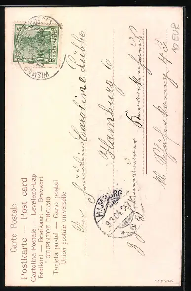 Personenbezogene Daten auf der Rückseite der Karte wurden durch blauen Textmarker unkenntlich gemacht. Die blauen Stellen sind auf die Vorderseite durchgeweicht und wirken sich negativ auf das Postkartenfoto aus