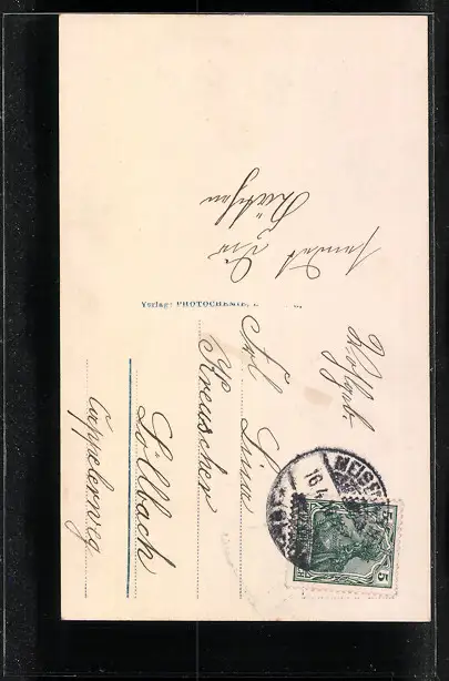 Personenbezogene Daten auf der Rückseite der Karte wurden durch blauen Textmarker unkenntlich gemacht. Die blauen Stellen sind auf die Vorderseite durchgeweicht und wirken sich negativ auf das Postkartenfoto aus