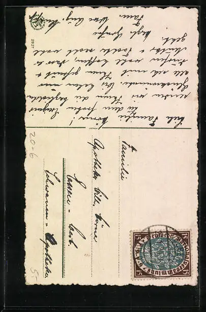 Personenbezogene Daten auf der Rückseite der Karte wurden durch blauen Textmarker unkenntlich gemacht. Die blauen Stellen sind auf die Vorderseite durchgeweicht und wirken sich negativ auf das Postkartenfoto aus
