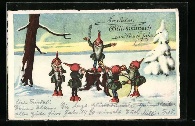 AK Glückwunsch zum neuen Jahr, Zwerge feiern im Schnee