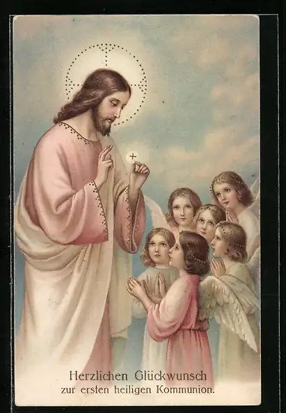 AK Glückwunsch zur ersten Kommunion, Jesus mit Engeln