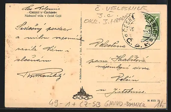 Personenbezogene Daten auf der Rückseite der Karte wurden durch blauen Textmarker unkenntlich gemacht. Die blauen Stellen sind auf die Vorderseite durchgeweicht und wirken sich negativ auf das Postkartenfoto aus