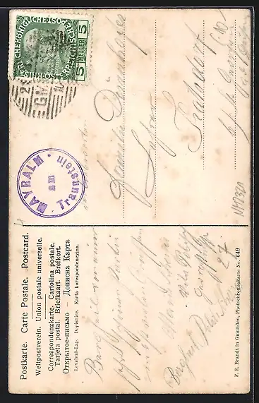 Personenbezogene Daten auf der Rückseite der Karte wurden durch blauen Textmarker unkenntlich gemacht. Die blauen Stellen sind auf die Vorderseite durchgeweicht und wirken sich negativ auf das Postkartenfoto aus
