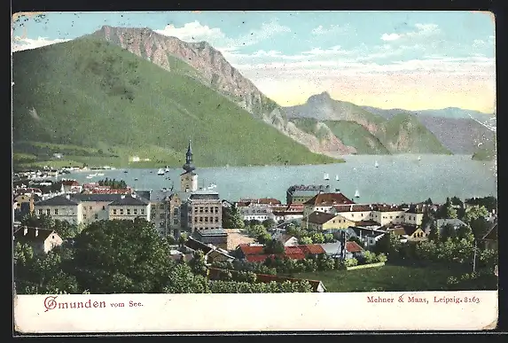 AK Gmunden, Ortsansicht mit See und Segelbooten