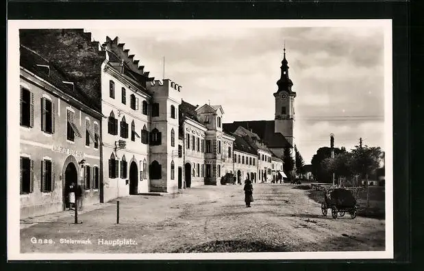 AK Gnas, Hauptplatz mit Kirche, Passantin und Wagen