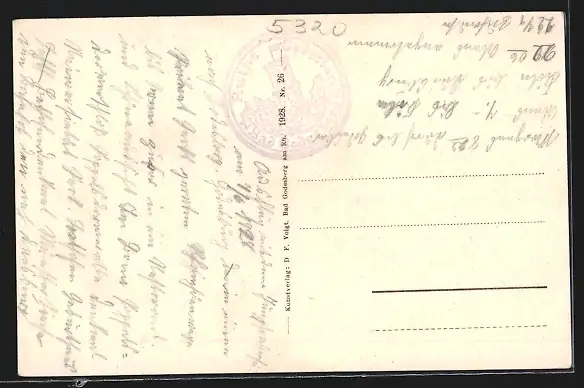 Personenbezogene Daten auf der Rückseite der Karte wurden durch blauen Textmarker unkenntlich gemacht. Die blauen Stellen sind auf die Vorderseite durchgeweicht und wirken sich negativ auf das Postkartenfoto aus