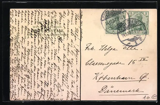 Personenbezogene Daten auf der Rückseite der Karte wurden durch blauen Textmarker unkenntlich gemacht. Die blauen Stellen sind auf die Vorderseite durchgeweicht und wirken sich negativ auf das Postkartenfoto aus