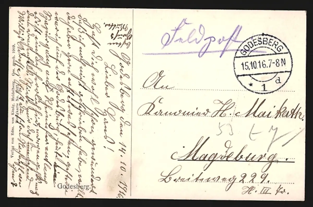 Personenbezogene Daten auf der Rückseite der Karte wurden durch blauen Textmarker unkenntlich gemacht. Die blauen Stellen sind auf die Vorderseite durchgeweicht und wirken sich negativ auf das Postkartenfoto aus