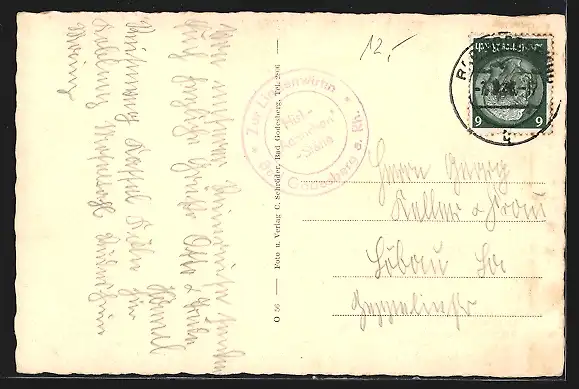 Personenbezogene Daten auf der Rückseite der Karte wurden durch blauen Textmarker unkenntlich gemacht. Die blauen Stellen sind auf die Vorderseite durchgeweicht und wirken sich negativ auf das Postkartenfoto aus