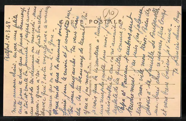 Personenbezogene Daten auf der Rückseite der Karte wurden durch blauen Textmarker unkenntlich gemacht. Die blauen Stellen sind auf die Vorderseite durchgeweicht und wirken sich negativ auf das Postkartenfoto aus