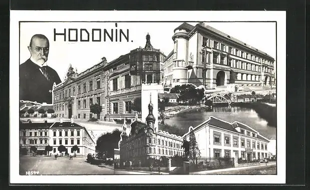 AK Göding / Hodonin, Gebäudeansicht, Uferpartie mit Brücke, Platz